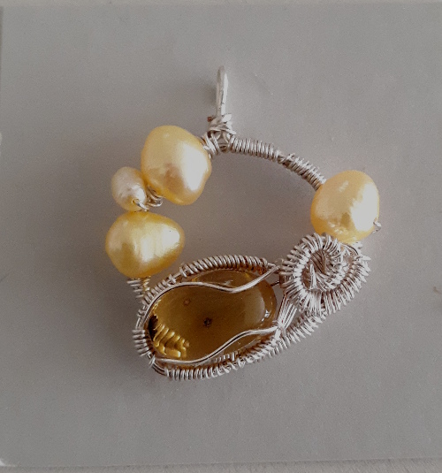 - Eye catching and casual Amber Pendant with Yellow Baroque pearls and a seed pearl wrapped in Silver Plated Wire
