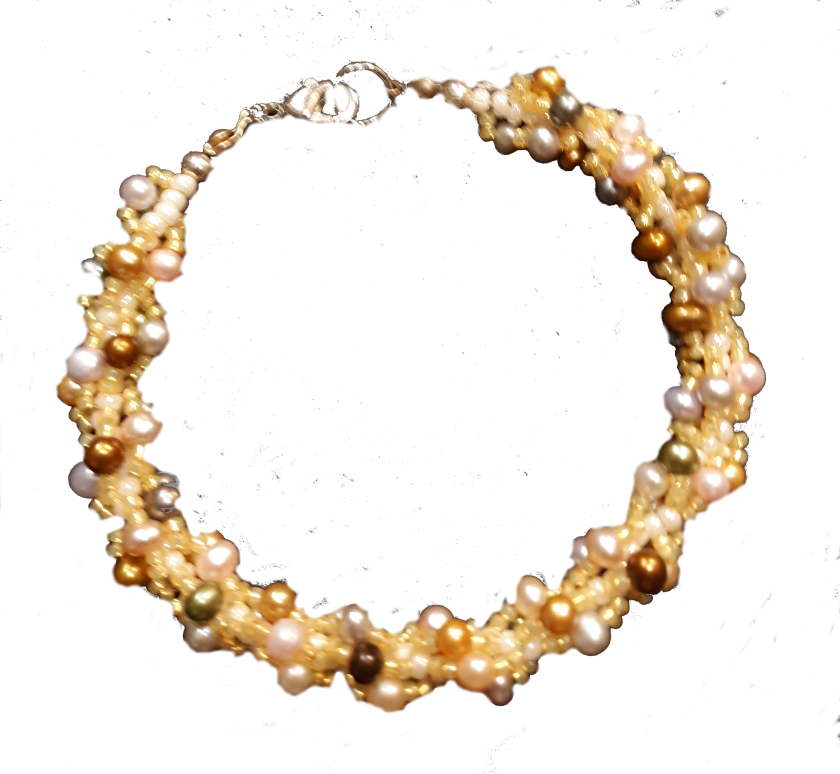 - Great bracelet for spring with pearls in off-white, blush,tan, and pistachio green with gold-lined off-white seed beads