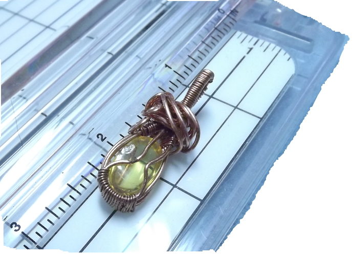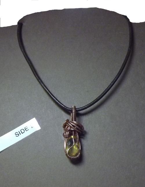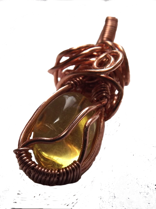 Casual and contemporary; asymmetric and fashionable; Semi-transparent Amber pendant wrapped in Copper Wire Cradle